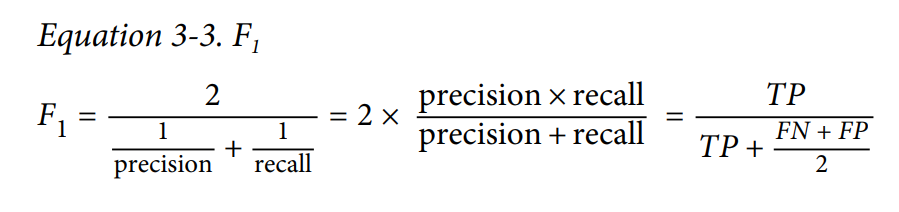 정밀도와 재현율을 F1 점수(F1 Score)라고 하는 하나의 숫자로 만들면 편리합니다. 특히 두 분류기의 성능을 비교할 때 그렇습니다. F1 점수는 정밀도와 재현율의 조화 평균을 통해 구합니다.