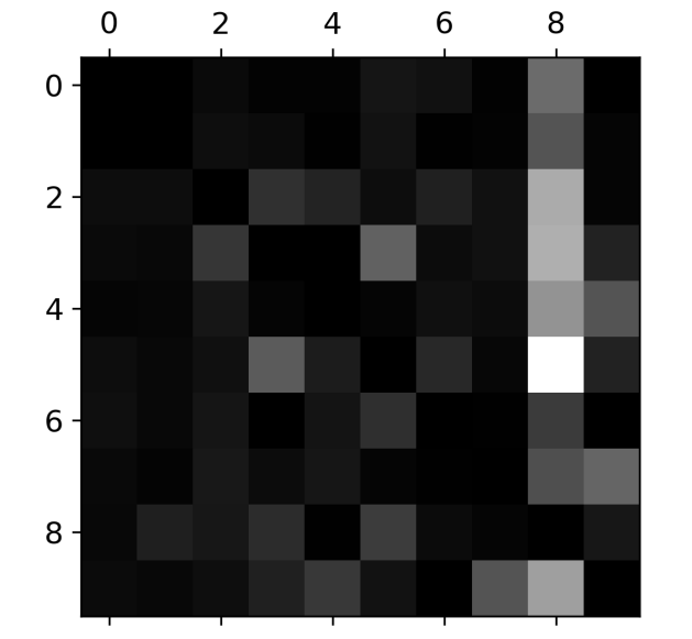 실제 프로젝트라 가정하고, 만약 가능성이 높은 모델 하나를 찾았다고 할 때 이 모델의 성능을 향상시킬 방법을 찾아보겠습니다. 한 가지 방법은 만들어진 에러의 종류를 분석하는 것입니다. 다중 분류기에서 오차 행렬을 그려보겠습니다.