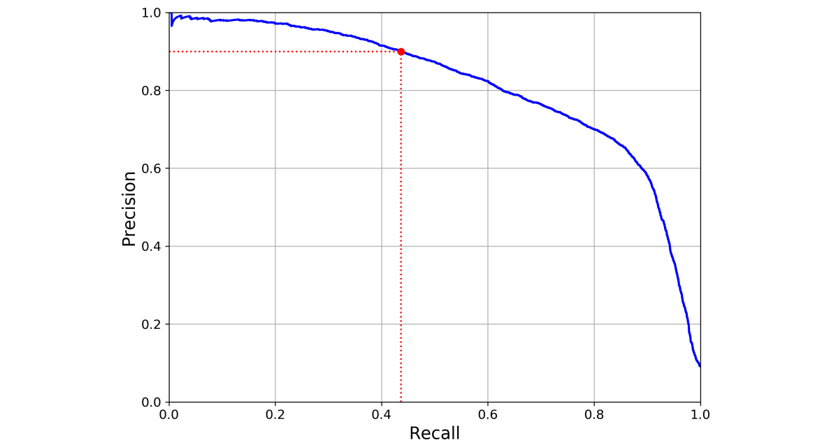 만약 정밀도 90%를 달성하는 것이 목표라면, 이에따른 임계값을 찾을 수 있고, 재현율 또한 구할 수 있습니다. (누군가가 "99% 정밀도를 달성하자" 라고 말하면 반드시 "재현율 얼마에서?" 라고 물어봐야 합니다.)