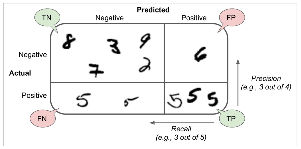 오차 행렬이 많은 정보를 제공해주지만 가끔 더 요약된 지표가 필요할 때도 있습니다. 먼저 살펴볼 만한 것 하나는 양성 예측의 정확도입니다. 이를 분류기의 정밀도(Precision) 라고 합니다. (정밀도 : 양성이라고 예측한 것들에 대해 얼마나 정확하게 예측하였는가)