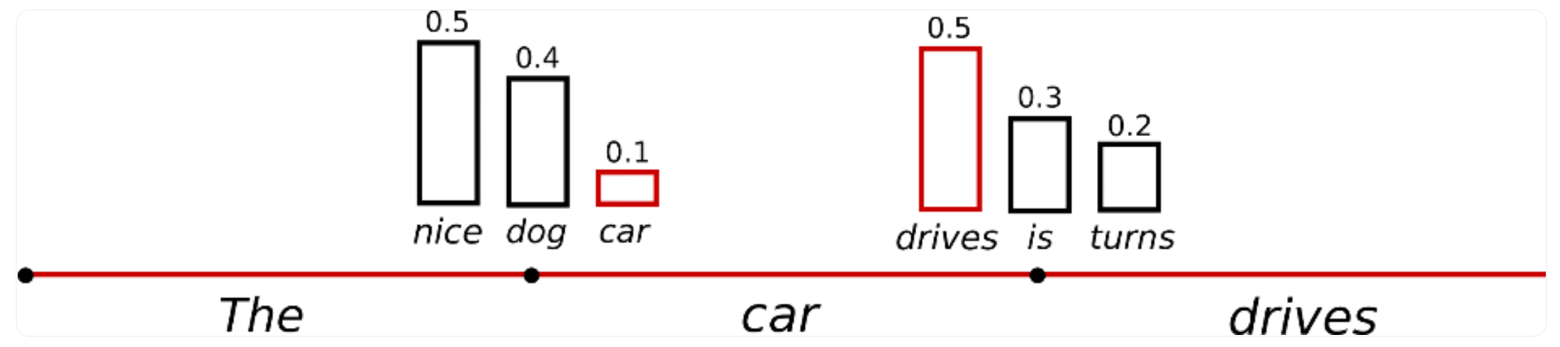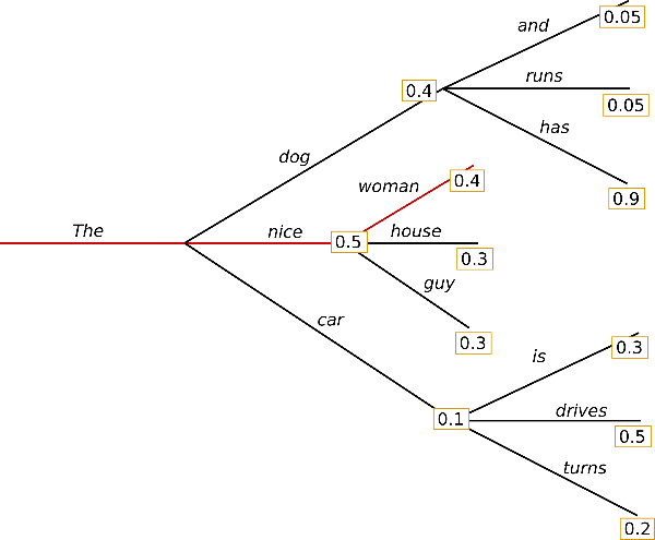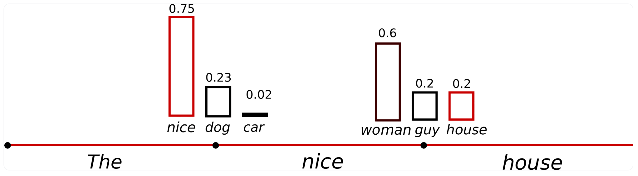 - 다음으로 "nice" 가 선택되고, 마침내 ("The", "nice", "woman") 이 선택되어 문장을 생성한다.
