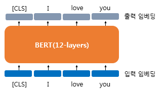 - [CLS]라는 벡터는 BERT의 초기 입력으로 사용되었을 입력 임베딩 당시에는 단순히 임베딩 층을 지난 임베딩 벡터였지만, BERT를 지나고 나서는 [CLS], I, love, you라는 모든 단어 벡터들을 모두 참고한 후에 문맥 정보를 가진 벡터가 됨.