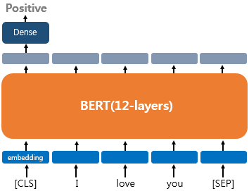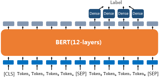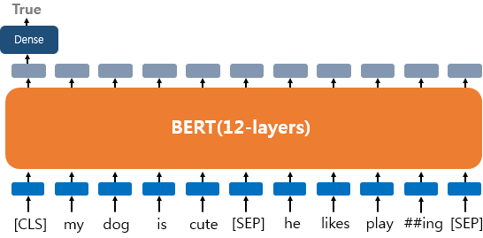 - 텍스트 분류 문제를 풀기 위해서 [CLS] 토큰 위치의 출력층에서 완전 연결층(fully-connected layer)이라고 불리는 층들을 추가하여 분류에 대한 예측 진행.