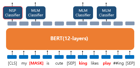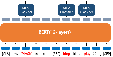 - 랜덤 단어 'king' 으로 변경된 토큰에 대해서도 원래 단어가 무엇인지, 변경되지 않은 단어 'play'에 대해서도 원래 단어가 무엇인지를 예측 해야 함.