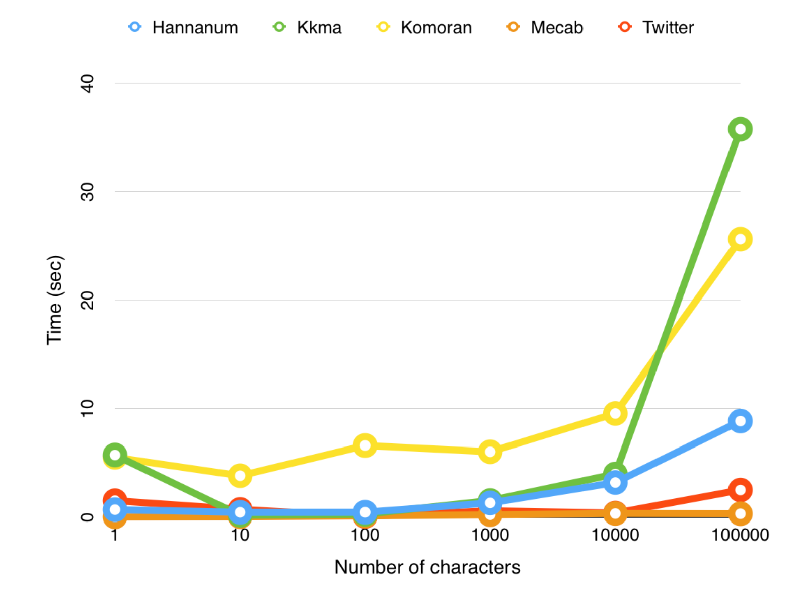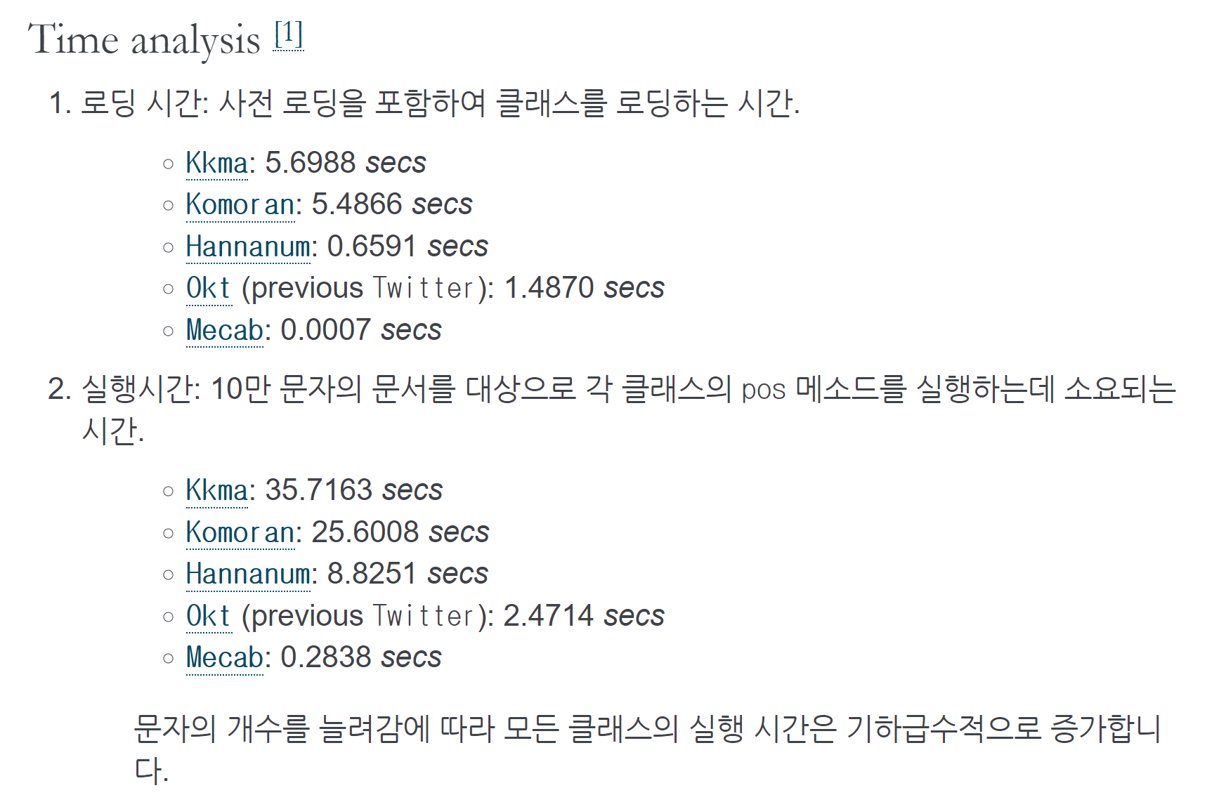 실행시간 : Kkma>Komoran>Hannanum>Okt>(Khaiii)>Mecab